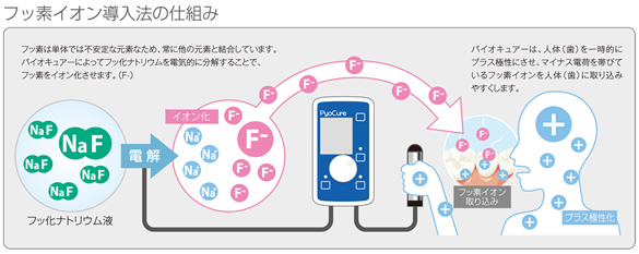 桑名はらだ歯科クリニックでは、フッ素イオン導入器を用いることで、フッ素をイオン化し、通常のフッ素塗布に比べ、より効果的にフッ素を歯に取り込ませます。