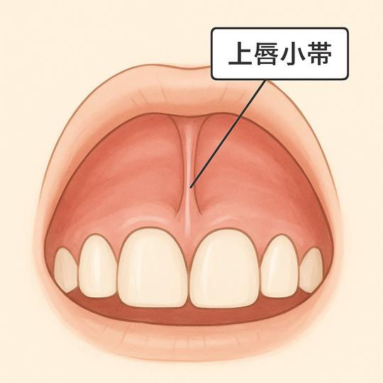 「上唇小帯(じょうしんしょうたい)」とは、上唇(うわくちびる)の裏側にある、唇と歯ぐきをつなぐ薄いヒダ状の組織のことです。